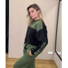 Худи — двухцветное, свободного и слегка укороченного кроя, с круглым вырезом. Длинные рукава с немного опущенной линией плеч обеспечивают удобство и свободу движений.